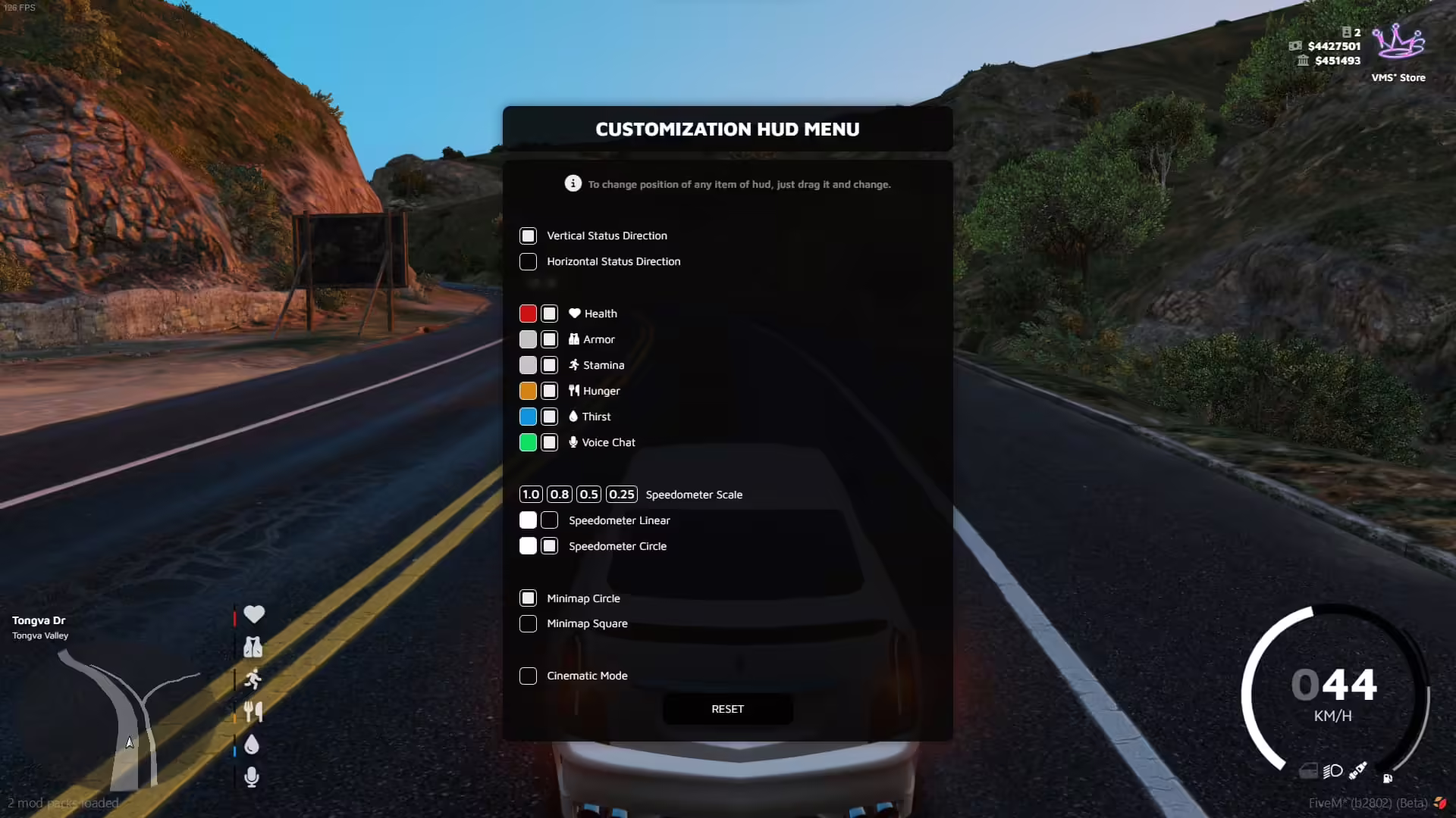 Révolutionnez l'expérience de vos joueurs avec VMS HUD, un système d'affichage tête haute entièrement personnalisable offrant un contrôle sans précédent sur les éléments de l'interface utilisateur. Ce HUD polyvalent propose des interfaces propres et modernes pour la santé, les statistiques du véhicule, l'état de la voix et les informations du joueur, tout en offrant à chaque utilisateur une liberté totale pour positionner, styliser et configurer son affichage. Compatible avec les frameworks ESX et QBCore , VMS HUD inclut des fonctionnalités intelligentes telles que des avertissements de statut bas par pulsation, la sauvegarde automatique du cache et une optimisation des performances qui maintient un gameplay fluide même sur les systèmes bas de gamme.